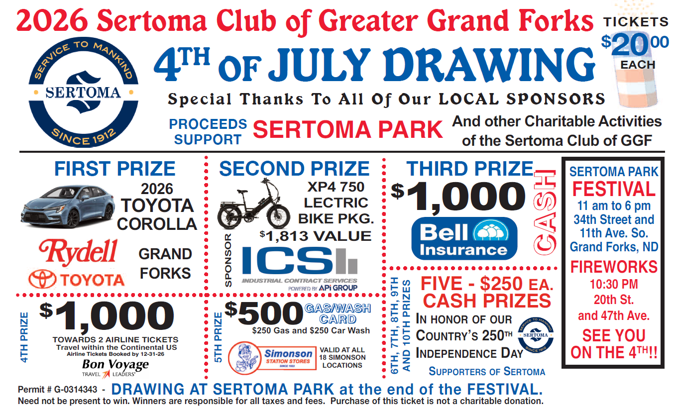 Our 4th of July raffle tickets are also available for purchase! Stop by our booth at the Grand Outdoors Show on February 13-15 at the Alerus Center or contact us (hyperlink to our email gfsertoma@gmail.com). Check out prizes – including a 2026 Toyota Corolla, e-bike, and more! All proceeds raised support improvements to Sertoma Park other charitable activities in our community. We are especially thankful for all sponsors and volunteers who make this event possible every year.